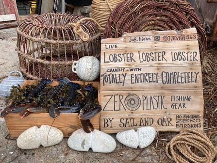 Jof has planted hundreds of willow trees in this area across the last three years. He has also restored and re-pollarded these withy beds that were used annually until a few decades ago by local fishermen for lobsterpot materials. This is a hotspot for wildlife adjacent to the Lower Moors wetland, and the patch is a great place to see birds and invertebrates. We are looking at the last of the year’s willow growth; all the other trees have been harvested. He is about to cut the final stems, which look beautiful against the blue of the sky: erupting from the trunk, they are golden-yellow at the base fading to a deep, burgundy red at the tips. The highest shoot 12-feet into the air, strong but pliable.